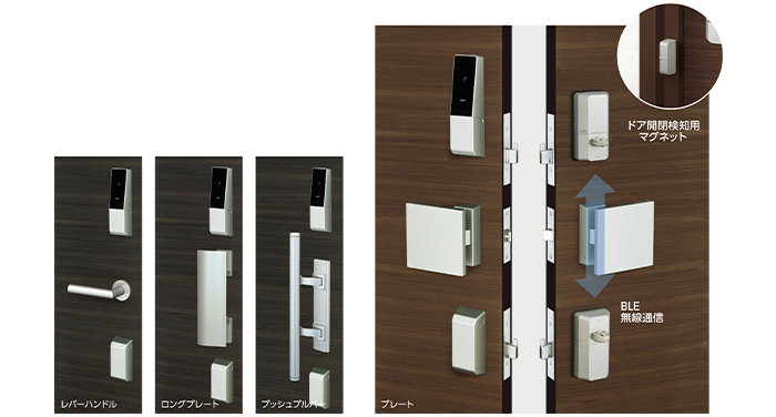 2ロック仕様は上下ユニット間をBLE(Bluetooth Low Energy)によって無線化し、配線のないスマートなデザインを実現。1ロック / 2ロック仕様のどちらも任意の空錠ハンドルタイプ(レバー、プレート、バー)の組み合わせが可能です。